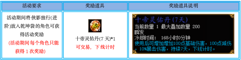 2、必须是在活动期间将侠影独行(进阶)放入乾坤袋才符合要求,非本次活动期间放入的无法获得奖励;