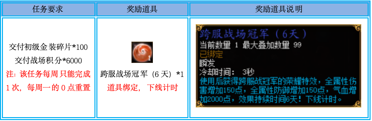活动期间,将会临时开启跨服战场活动,等级达到61级的角色可接取以下任务(活动期间战场狂热者任务不开放):