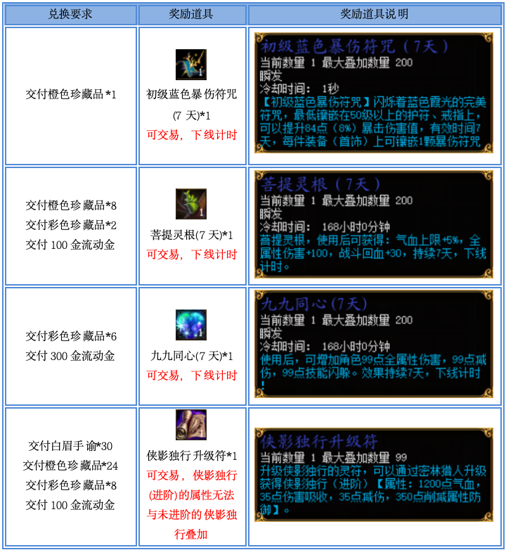 1、活动期间与“藏宝阁阁主”对话可兑换以下各类道具: