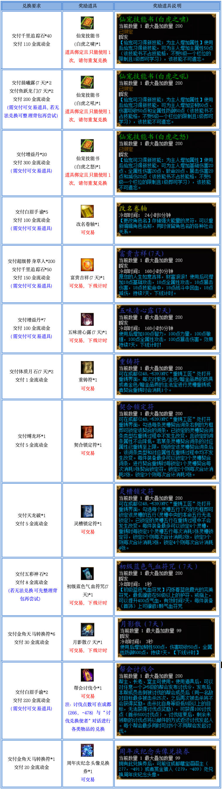 3、兑换获得的道具中,除【白虎之啸】、【白虎之吼】、【白虎之怒】这三本技能书为绑定,其余道具均可进行交易;