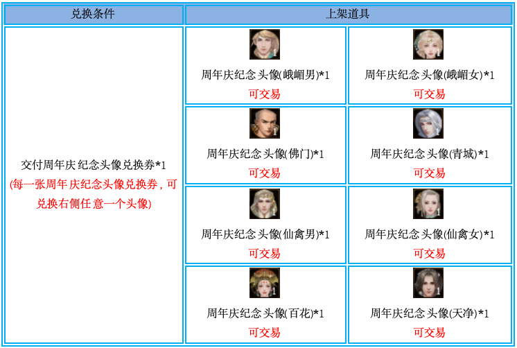 4、本次上架的道具中,除了周年庆纪念头像暂不下架外,其余道具将在活动结束后下架,若有需要还请尽快兑换;