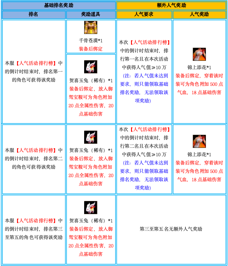 4、“基础排名奖励”只要在【人气活动排行榜】结束时达到指定名次要求即可领取;